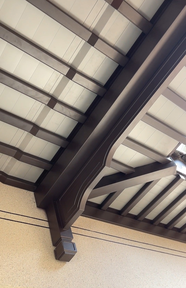 此次项目涵盖封檐板、金花板、回纹板、茶壶轩、鹅颈护栏等核心外装构件。封檐板线条流畅,如灵动的笔触勾勒出屋檐的优美轮廓,既起到保护建筑的实用功能,又赋予建筑独特的韵律美感;金花板与回纹板上,传统纹样栩栩如生,采用高精度雕刻工艺,将中式美学中的吉祥寓意与繁复之美展现得淋漓尽致;茶壶轩造型别致,飞檐翘角,仿佛将传统茶文化的韵味融入建筑之中;鹅颈护栏线条婉转优雅,不仅保障安全,更与整体庭院风格相得益彰,营造出一步一景的中式意境。