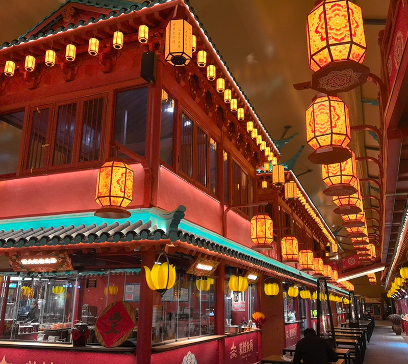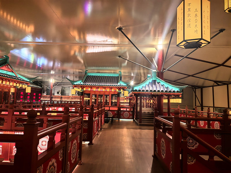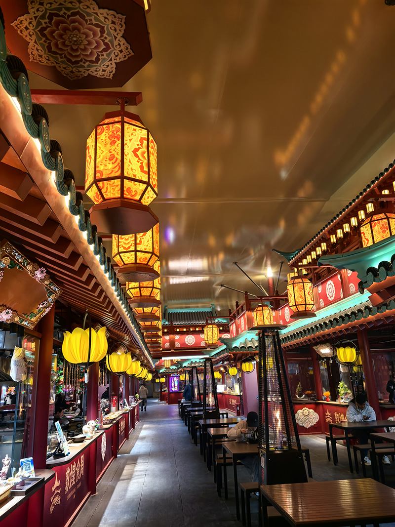 项目采用的铝镁锰合金瓦与定制铝制仿古构件,具备轻质高强、抗风防腐、耐候耐久、易维护等优势,完美适配敦煌户外环境;钢结构体系稳固可靠,保障大空间、多业态美食城的使用安全与运营效率。精匠建业以“精工匠造、仿古如古”的标准,让现代金属工艺与传统古建美学相融,为游客呈现烟火气与文化感兼具的消费新场景。