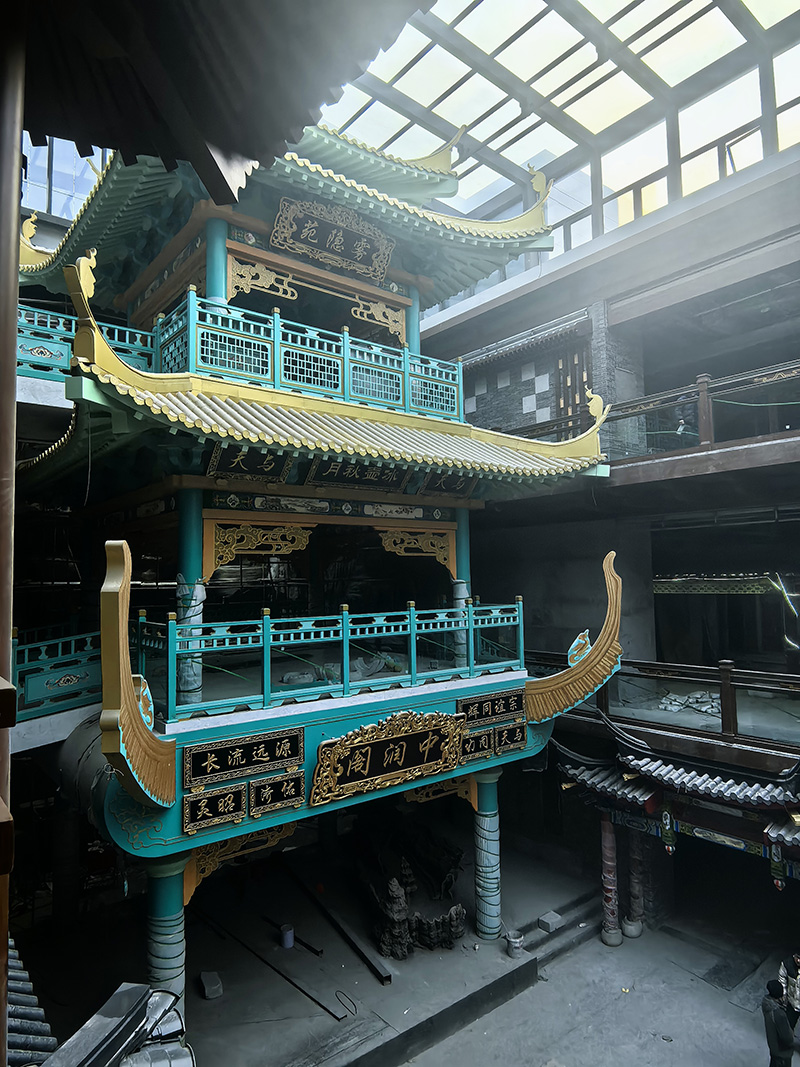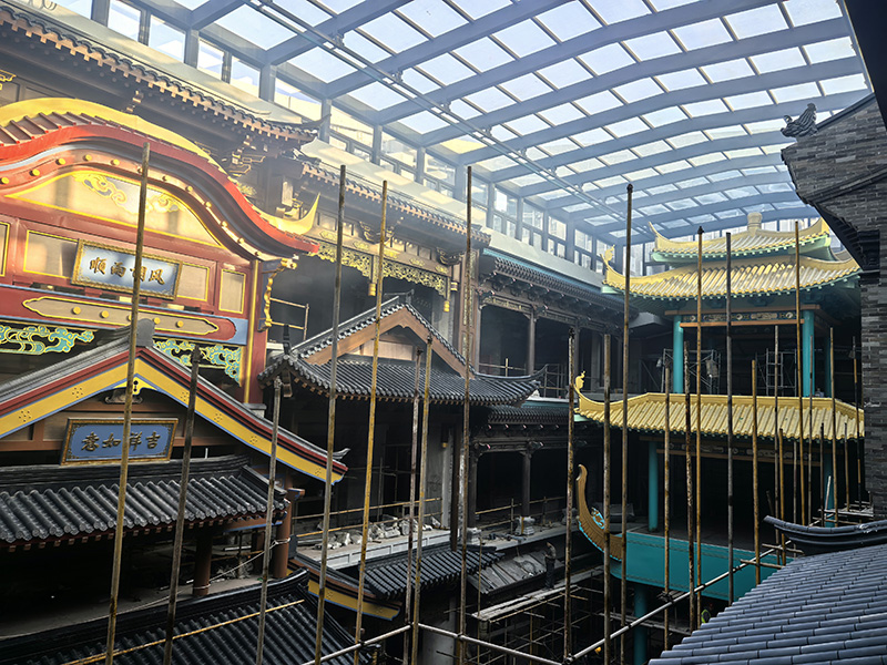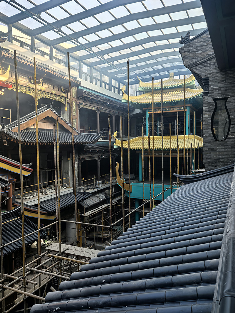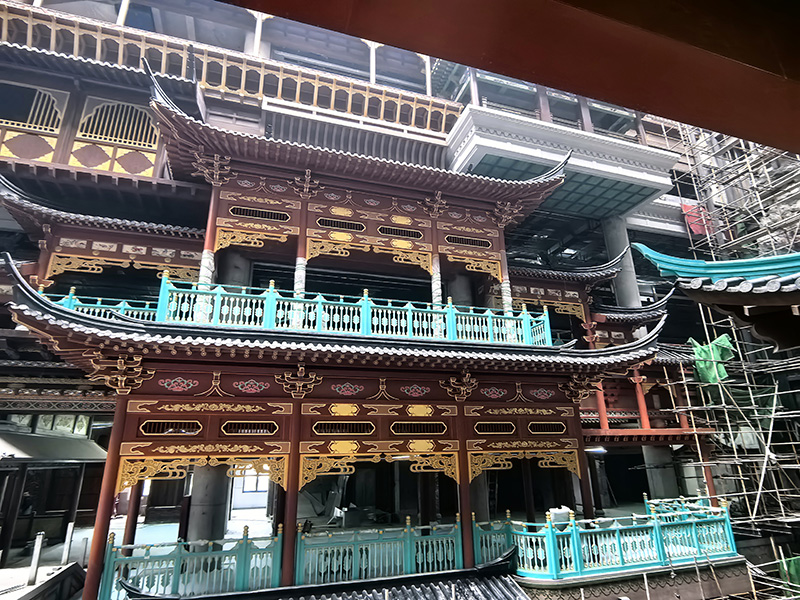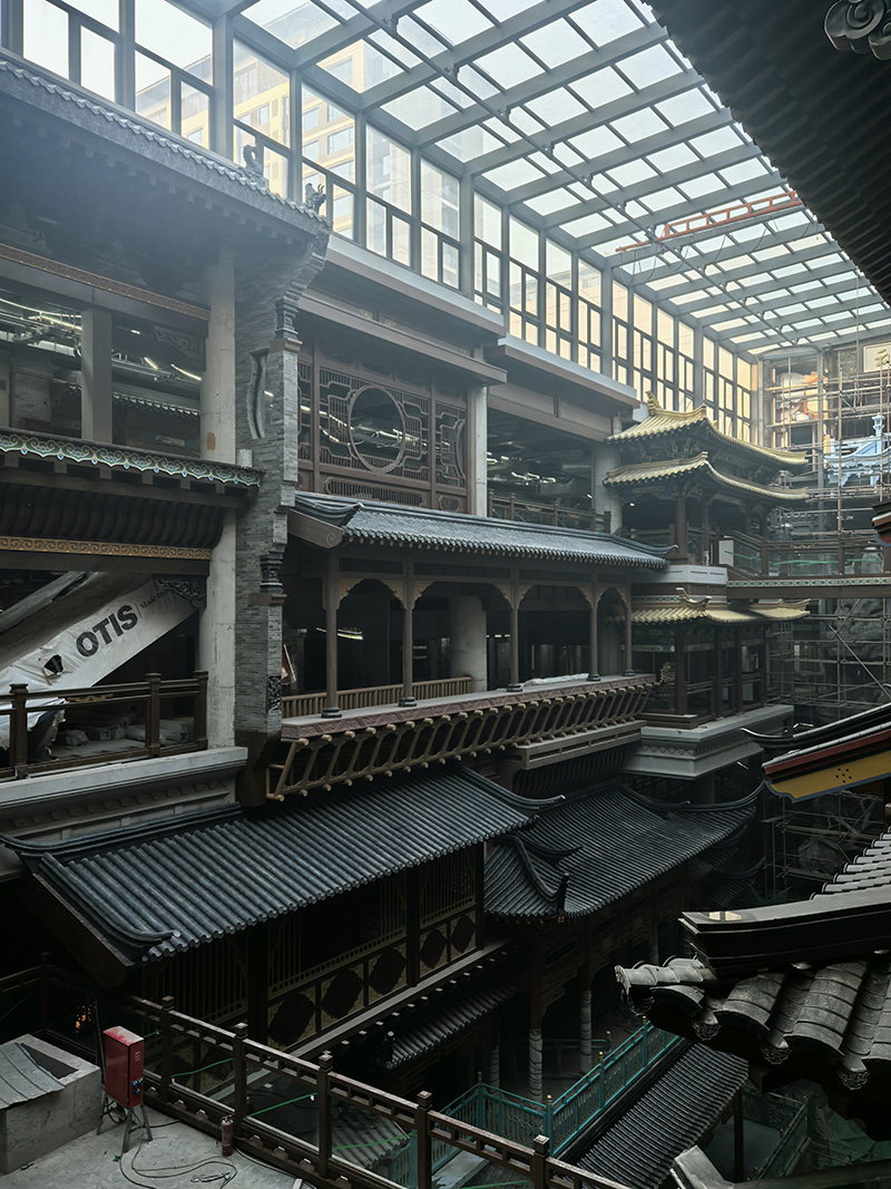 汲古润今项目定位集文化体验、特色商业、休闲消费、场景打卡于一体的室内古风商业标杆,以多层次、主题化国风场景构建沉浸式消费空间。精匠建业作为本项目整体仿古材料承建方,全面负责铝镁锰合金瓦、钢结构、发泡陶瓷、木雕、人工彩绘、铝制仿古构件、仿古门窗等全品类材料的深化设计、定制生产与现场安装。针对商城内部七层大体量、高环保、高防火、高颜值的商业空间要求,公司团队统筹工艺、严控品质、高效协同,克服多工序交叉、场景还原度高、施工精度要求严等挑战,按期高质量完成全部施工内容。