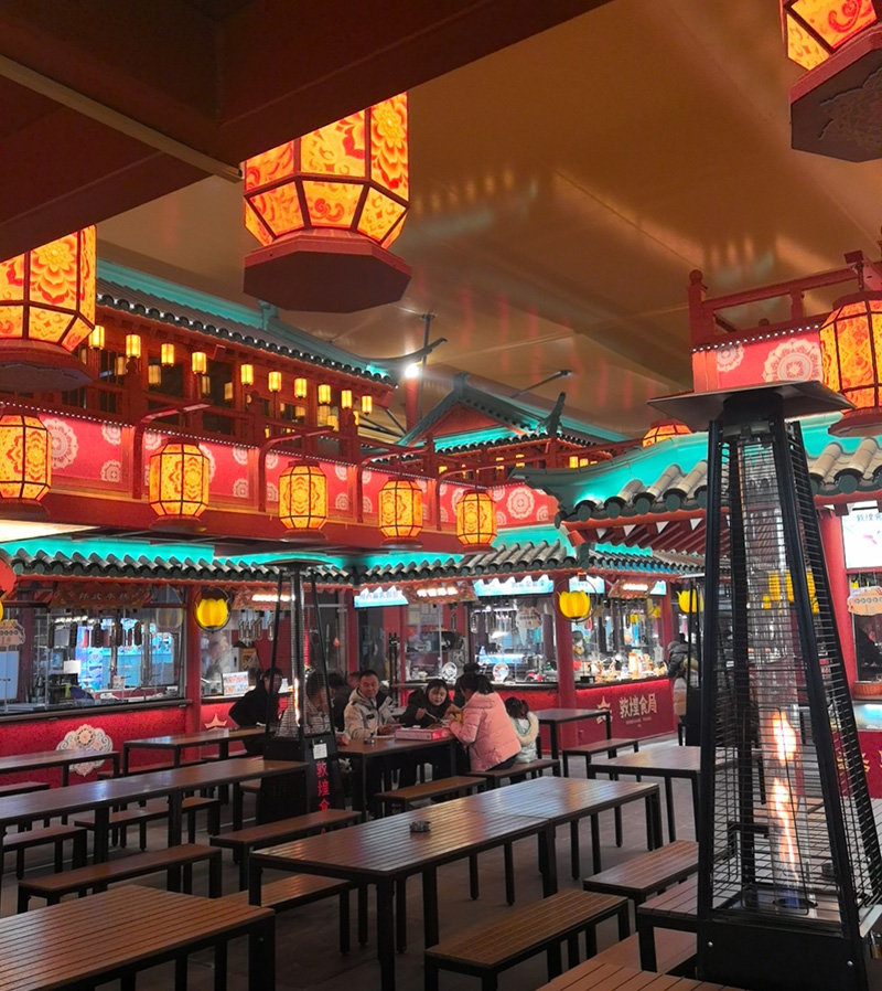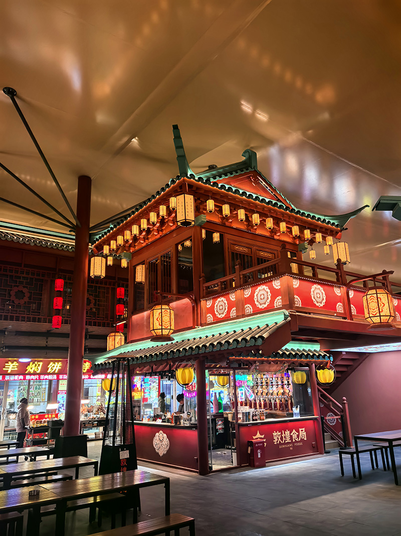 项目采用的铝镁锰合金瓦与定制铝制仿古构件,具备轻质高强、抗风防腐、耐候耐久、易维护等优势,完美适配敦煌户外环境;钢结构体系稳固可靠,保障大空间、多业态美食城的使用安全与运营效率。精匠建业以“精工匠造、仿古如古”的标准,让现代金属工艺与传统古建美学相融,为游客呈现烟火气与文化感兼具的消费新场景。